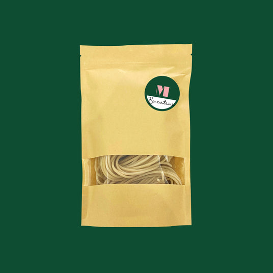 300 gramos de pasta Bucatini fresco, una pasta larga tubular que proviene de la zona de Latzio en Italia. Su nombre proviene de la lengua napolitana y significa "pasta perforada". Porción para 2 a 3 personas.