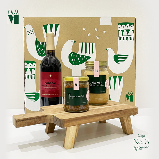 Con esta caja podrás disfrutar algo que nos encanta en Casa M®, sentarnos junto al pino disfrutar un buen aperitivo y una botella de vino.